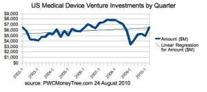 In Q2 2010, trend data from the NVCA and PWC (Fig. 1) showed a medical device venture bubble in 2006 and 2007, followed by a corrective dip in 2008, and a return to the trendline in Q2 2010.